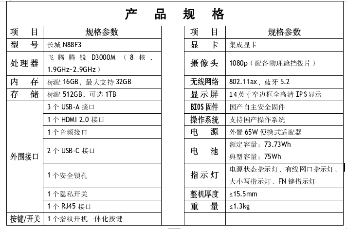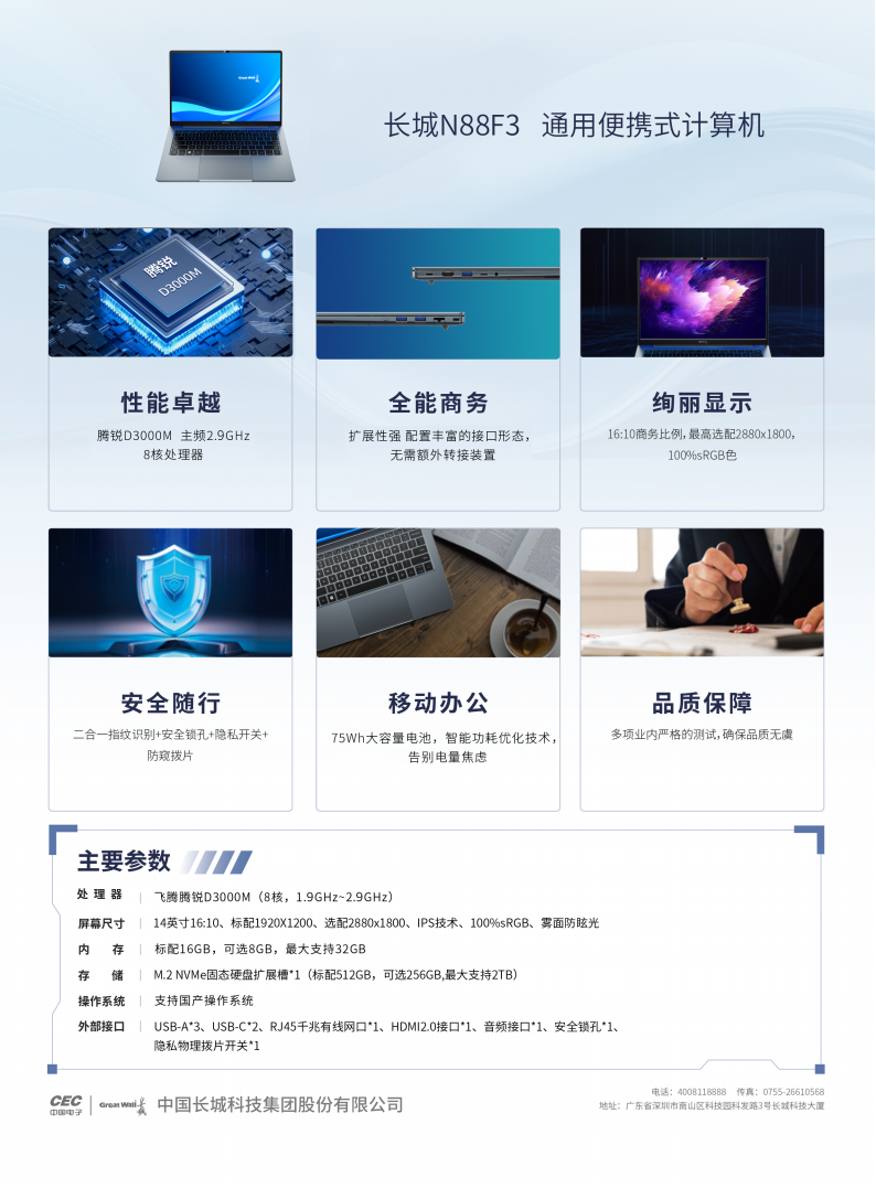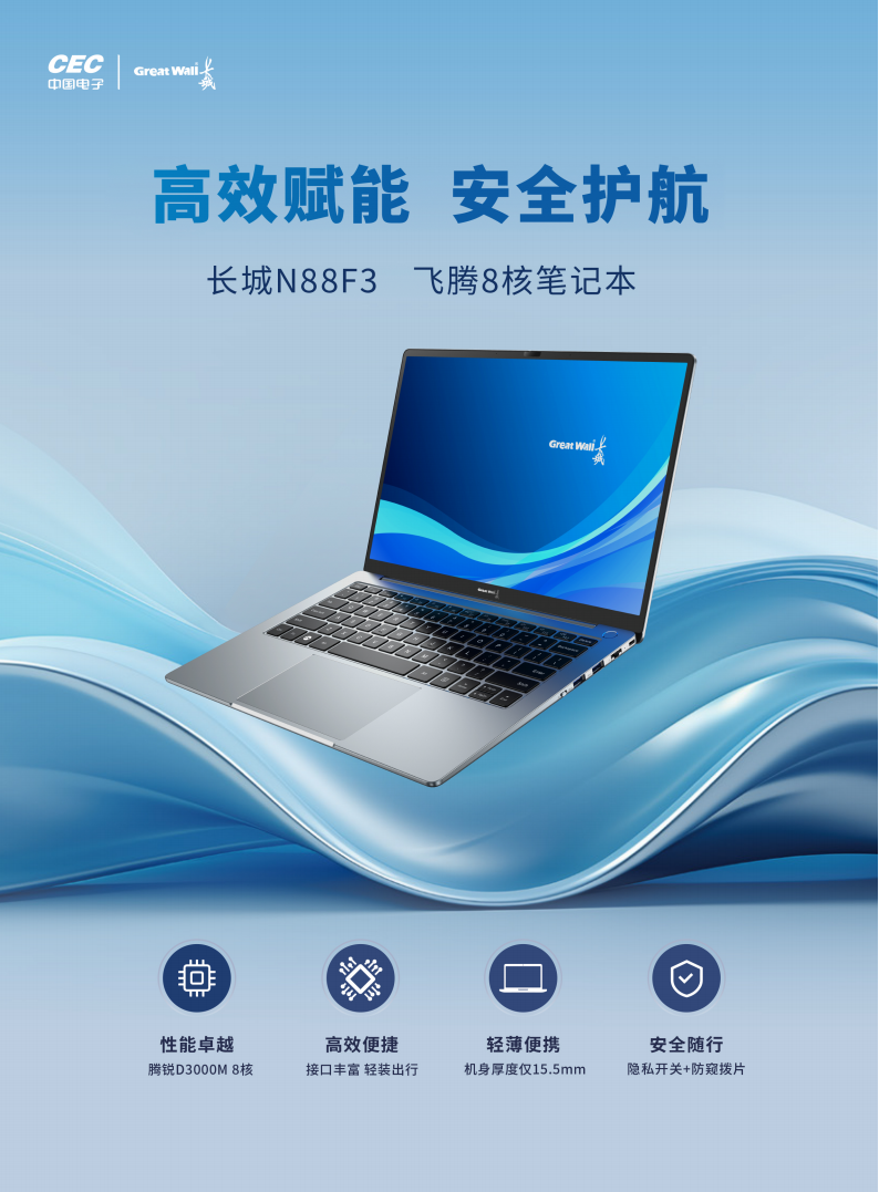 長城N88F3便攜式計算機(jī)是基于飛騰騰銳D3000M 8核處理器,搭配國產(chǎn)自主固件和國產(chǎn)操作系統(tǒng)的全能時尚便攜式計算機(jī)。該產(chǎn)品采用鋁合金外觀設(shè)計,搭配國產(chǎn)14英寸16:10全高清窄邊框廣視角顯示屏,內(nèi)置雙頻WiFi6、指紋識別、大容量電池,支持快充、關(guān)機(jī)對外充電,輕松適應(yīng)各種商用辦公環(huán)境。產(chǎn)品充分適配國產(chǎn)瀏覽器、辦公軟件、音視頻播放軟件、圖形處理等主流應(yīng)用軟件,適用于黨政系統(tǒng)、金融、能源、電信等重點行業(yè)信息化領(lǐng)域,滿足用戶日常移動辦公需求。