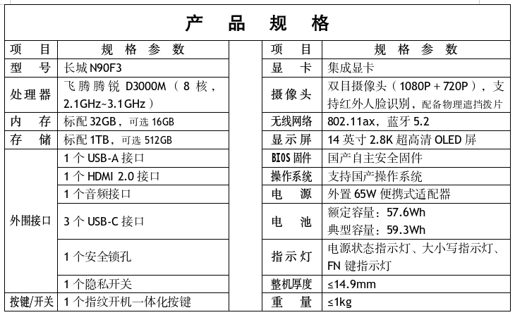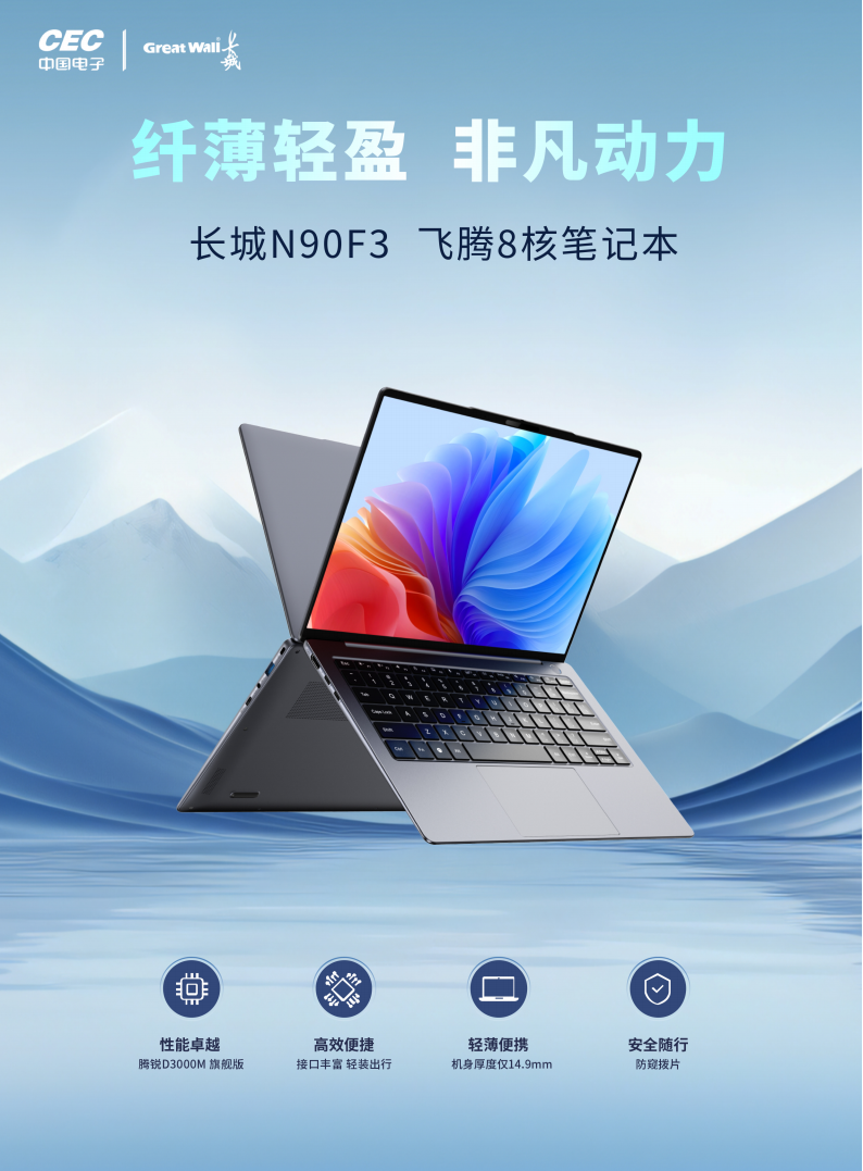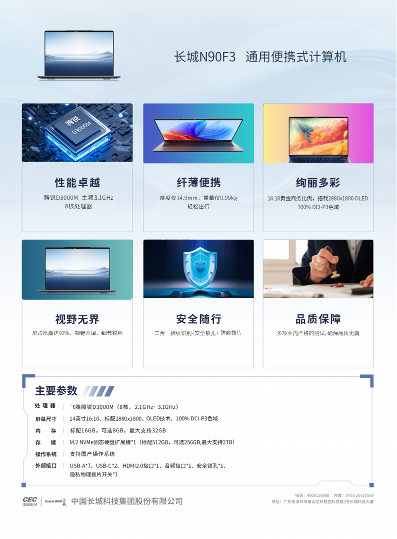 長(zhǎng)城N90F3便攜式計(jì)算機(jī)是基于飛騰騰銳D3000M 8核旗艦版處理器,搭配國(guó)產(chǎn)自主固件和國(guó)產(chǎn)操作系統(tǒng)的超輕薄便攜式計(jì)算機(jī)。該產(chǎn)品采用全鎂合金外觀設(shè)計(jì),配備14英寸超高清2.8K OLED顯示屏,屏占比高達(dá)92%,整機(jī)厚度僅14.9mm,內(nèi)置雙頻WiFi6、指紋識(shí)別、支持快充、關(guān)機(jī)對(duì)外充電,輕松適應(yīng)各種商用辦公環(huán)境。產(chǎn)品充分適配國(guó)產(chǎn)瀏覽器、辦公軟件、音視頻播放軟件、圖形處理等主流應(yīng)用軟件,滿足用戶日常移動(dòng)辦公需求。